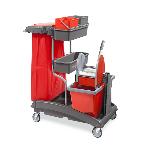 Carrello multiuso IdeaTop 6 completo di: base più finalino in polipropilene copolimero, 1 spalla curva con maniglia, 2 secchi da 6 lt, 2 secchi da 15 lt, 2 cestelli portasecchi, 1 portapressa, 1 pressa per mop, reggisacco completo di 2 portamanico e 4 agganci, 4 ruote Ø 100 mm.