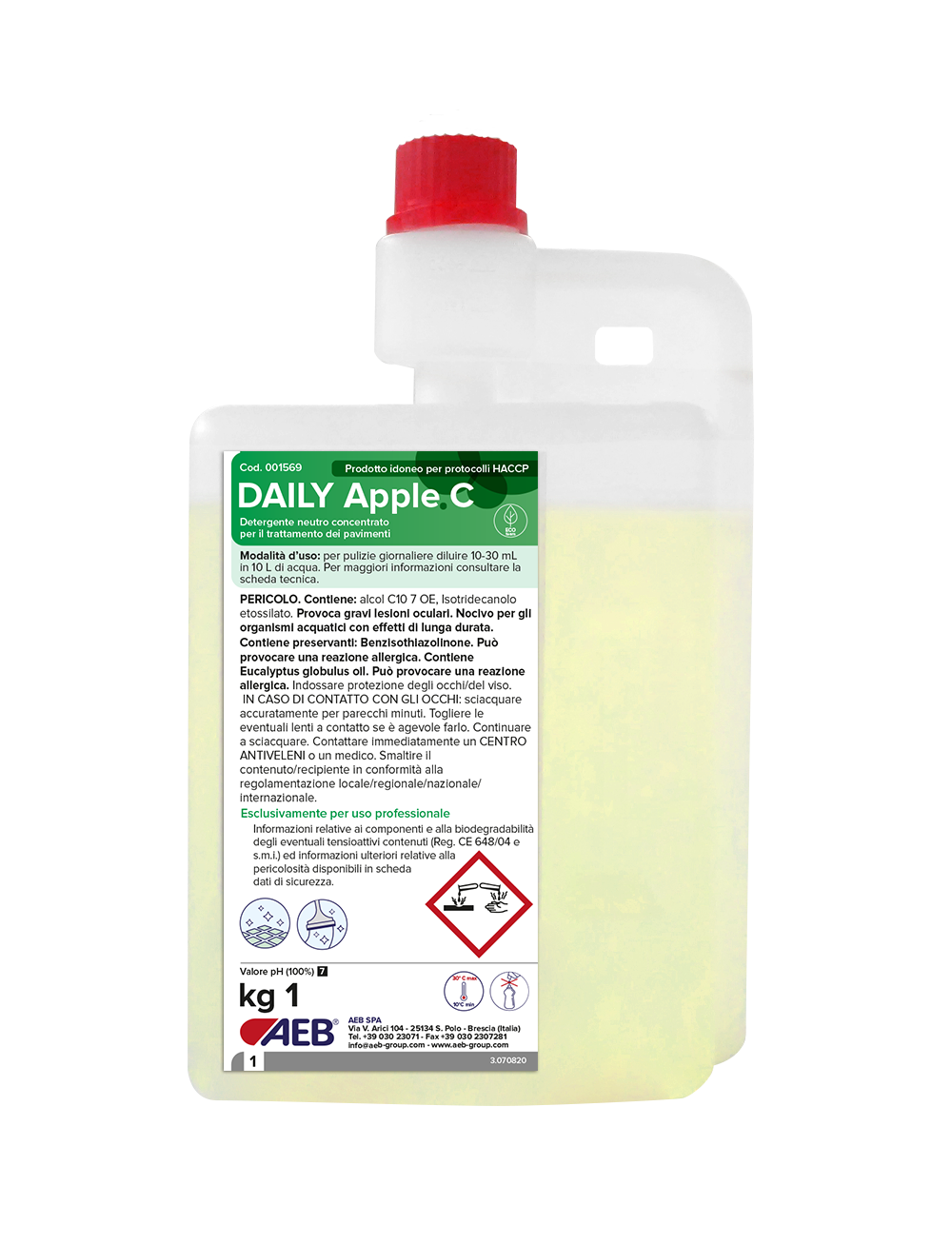 Daily Apple C è un detergente liquido concentrato adatto per tutti i trattamenti di pulizia giornaliera dei