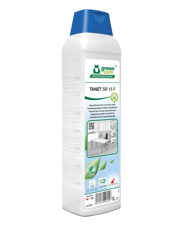 TANET SR15 F è un detergente di manutenzione ad altissime prestazioni per pavimenti e superfici, senza profumo né colore, con eccellenti proprietà ambientali. Rispetta  la salute delle persone e la sicurezza degli operatori